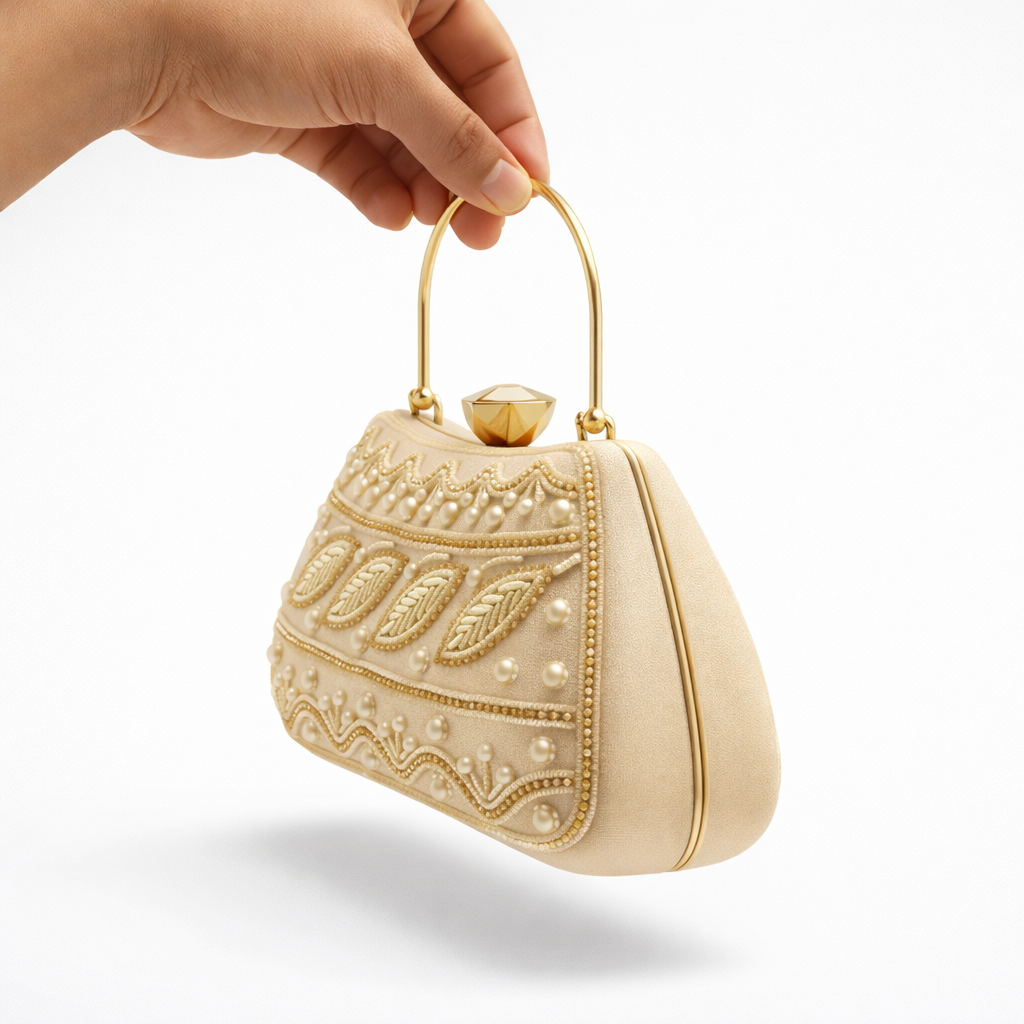 Smooth stitching, premium metal fittings, and neat finishing make this hand purse classy.